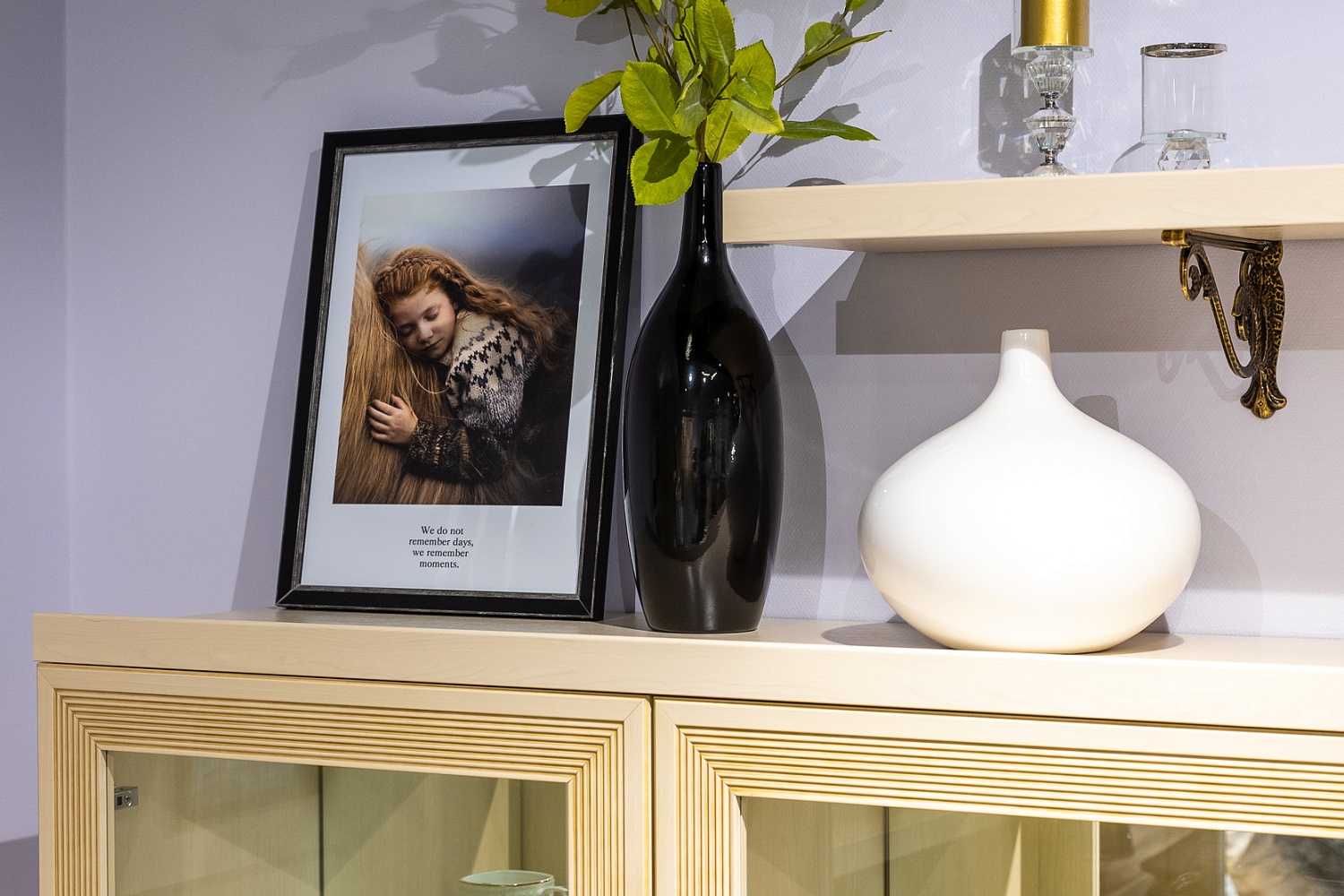 - В гостиной есть вся необходимая мебель для хранения: два напольных шкафа, тумба с выдвижным ящиком и две вместительные полки. Для самого важного всегда найдется место;