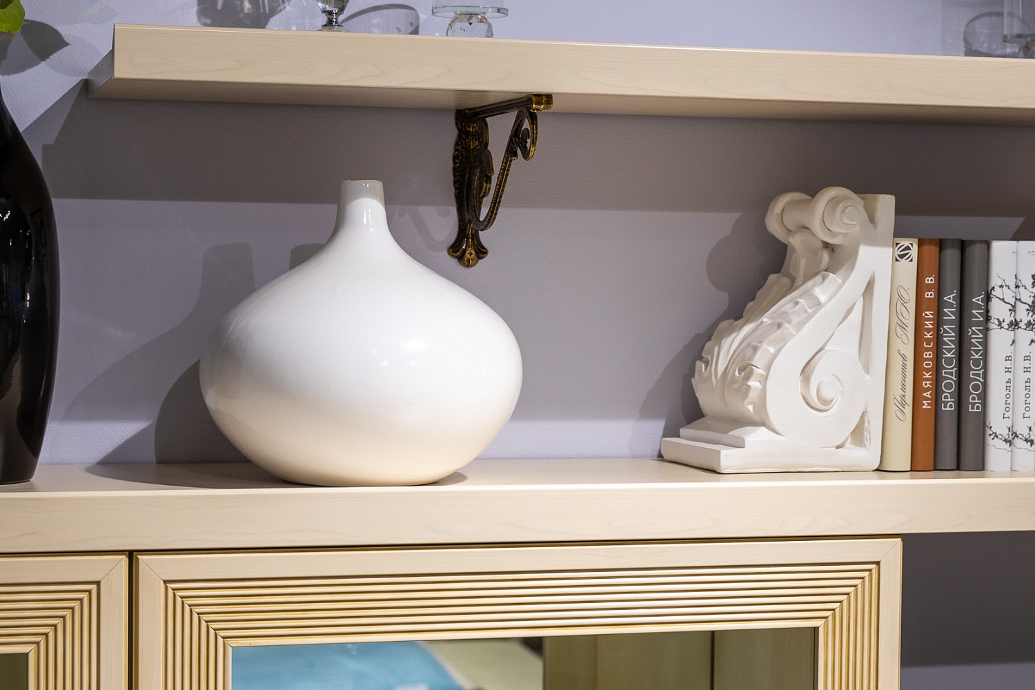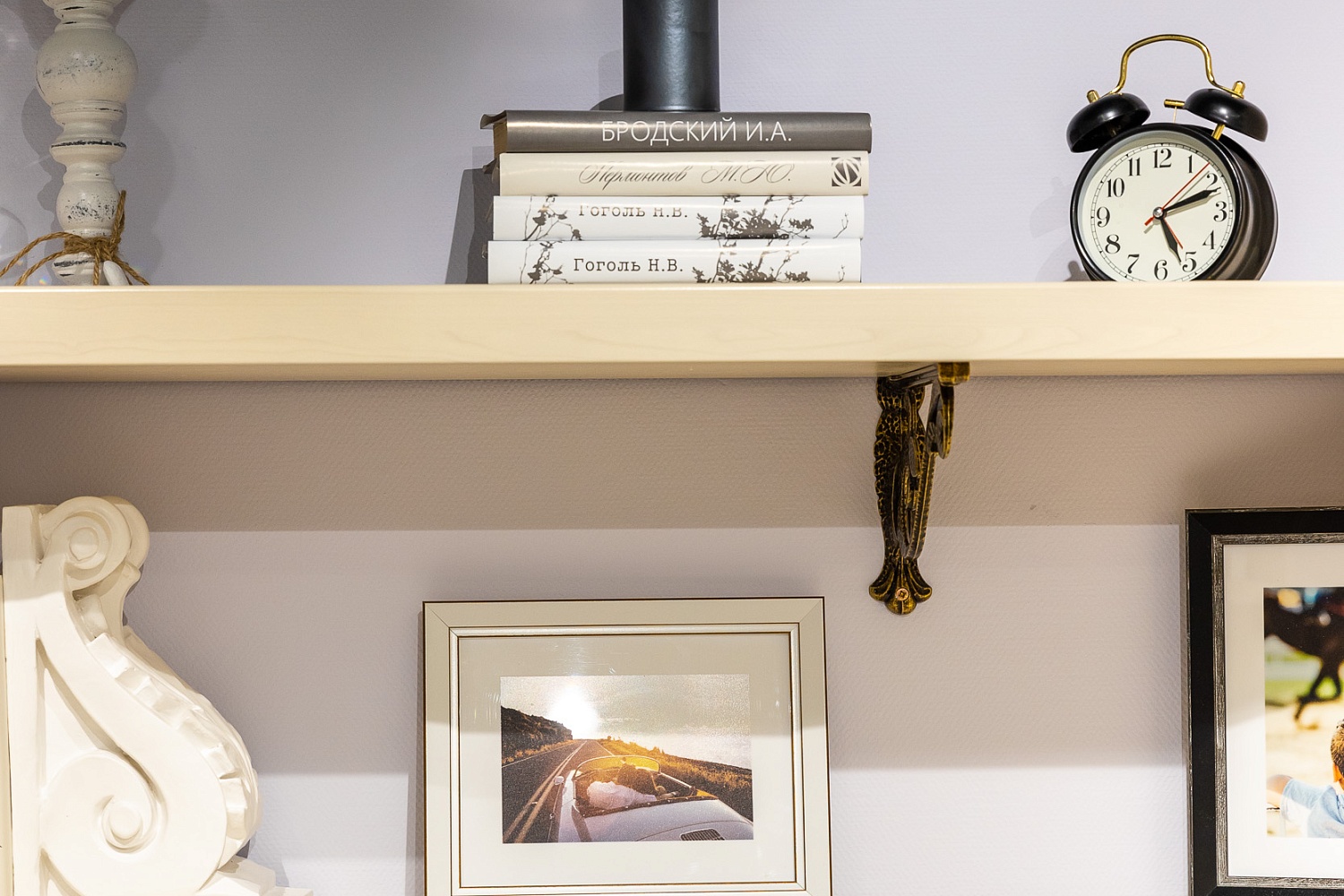 Полки навешиваются на стену на декоративных менсолодержателях (МакМарт).