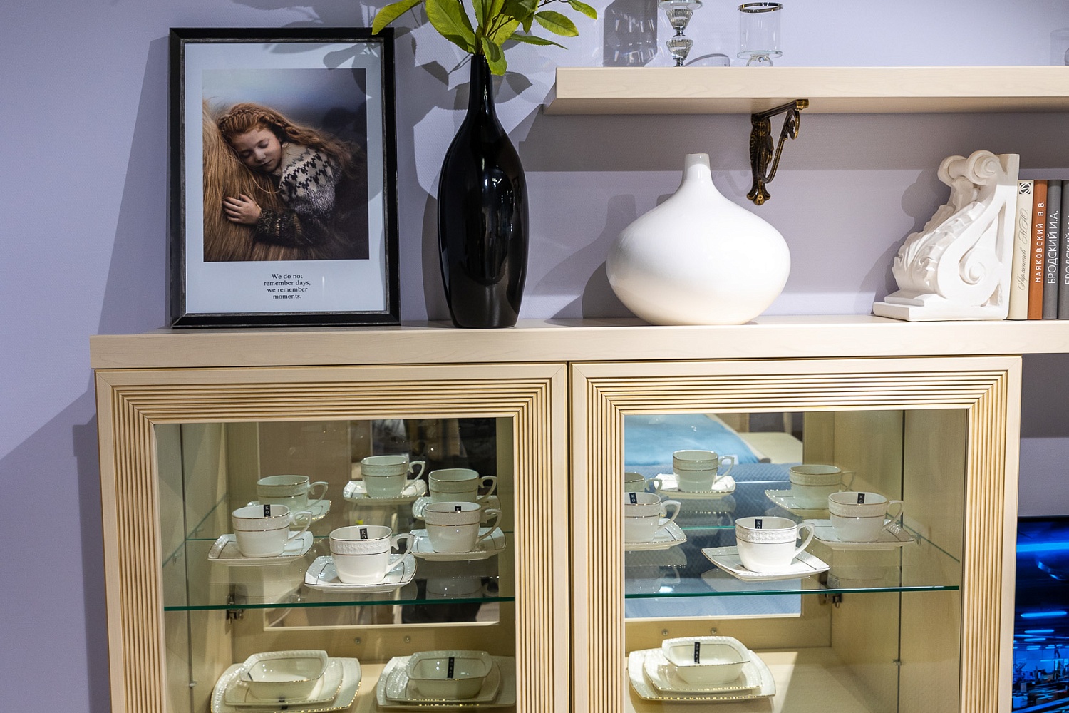 - На задних стенках шкафов со стеклянными вставками есть зеркала. Это помогает зрительно расширить комнату.