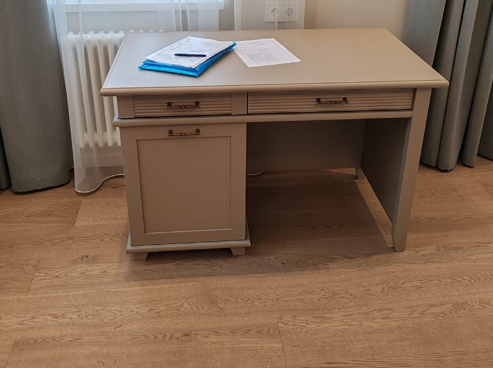 - Под столешницей — отделение с двумя выдвижными ящиками. На задней стороне стола — фальшпанели (с декоративными профилями), повторяющие внешний вид фасадов ящиков;