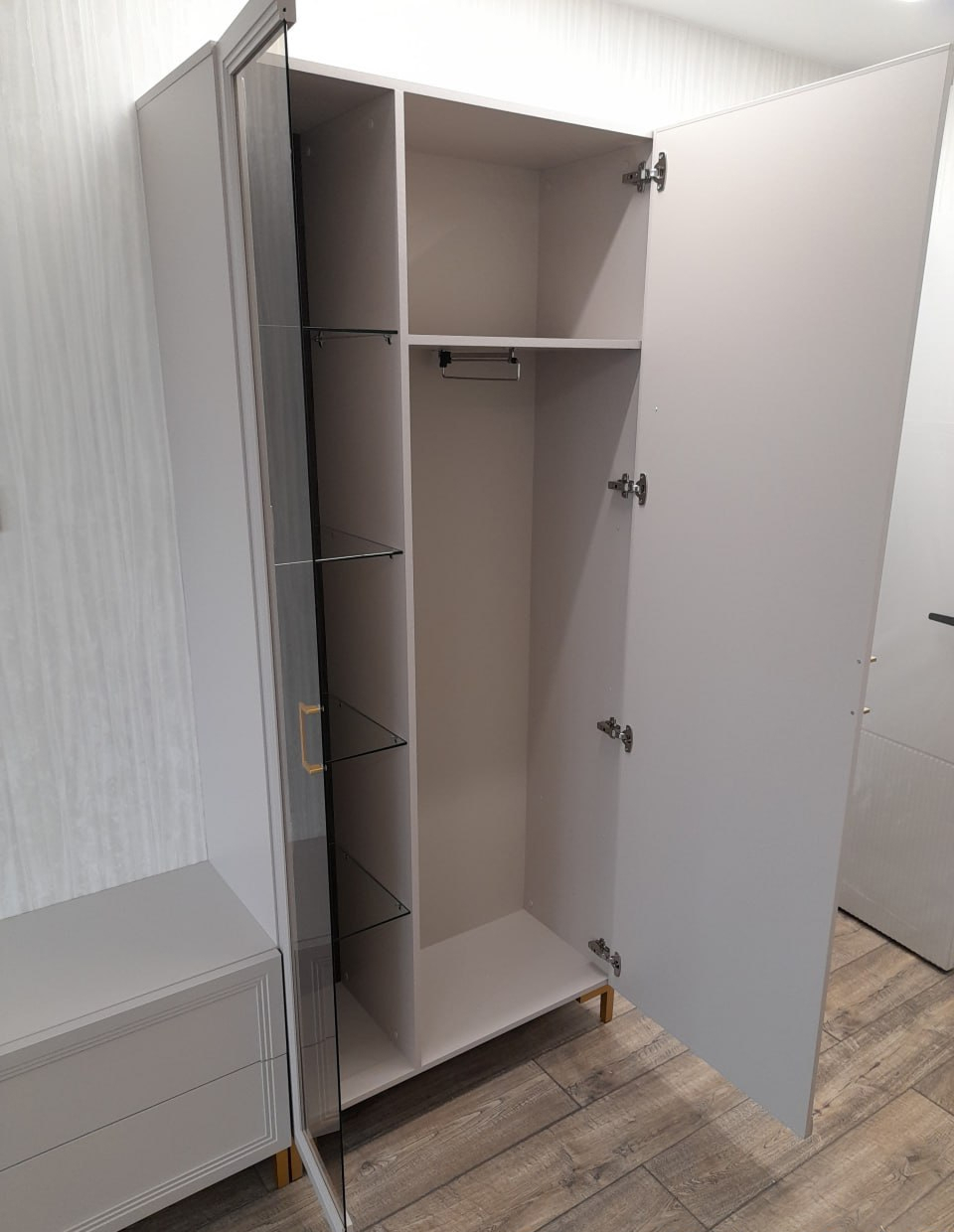 - Внутреннее наполнение: 4 стеклополки 6 мм за стеклянным фасадом, 1 полка ЛДСП 16 мм, и выдвижная штанга — за глухим;